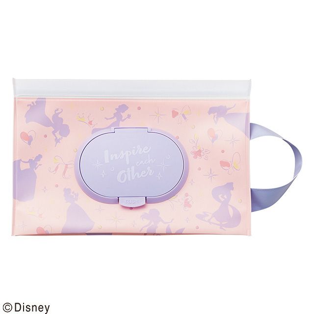 ディズニープリンセスのシルエットがデザインされたフタ付きキャリーポーチです。おでかけの際などにウェットティッシュなどを袋ごと入れて使えます。便利なチャックシール付き♪持ち手も取り外し可能です。