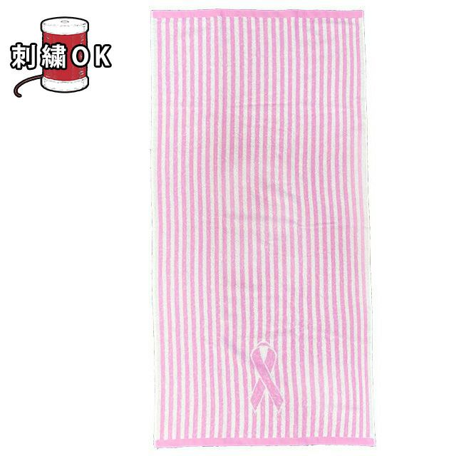 この商品の売り上げの一部は乳房健康研究会を通じ、乳がんの知識を広めるためのイベントや講座の開講や、女性技師の育成の支援活動に役立てられます。ピンクリボンデザインのバスタオルです。