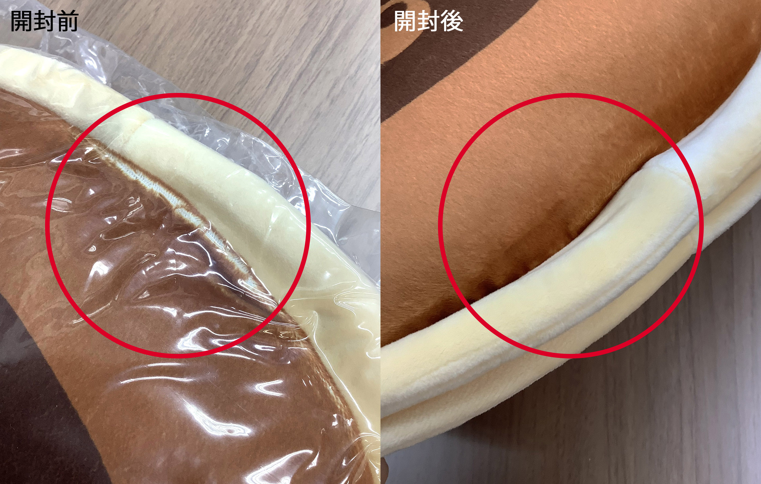 もちもちクッションは一部商品保管時・配送時に圧縮しているものがあり、パイル割れが発生する可能性がございますが、袋から取り出して膨らんだ後毛並みを整えると解消されますのでそのままご使用くださいませ。